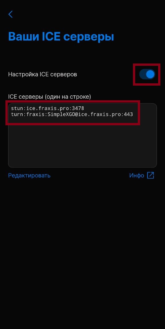 Скопируйте данный текст полностью и добавьте в список ICE серверов как на скриншоте (он нужен для звонков)